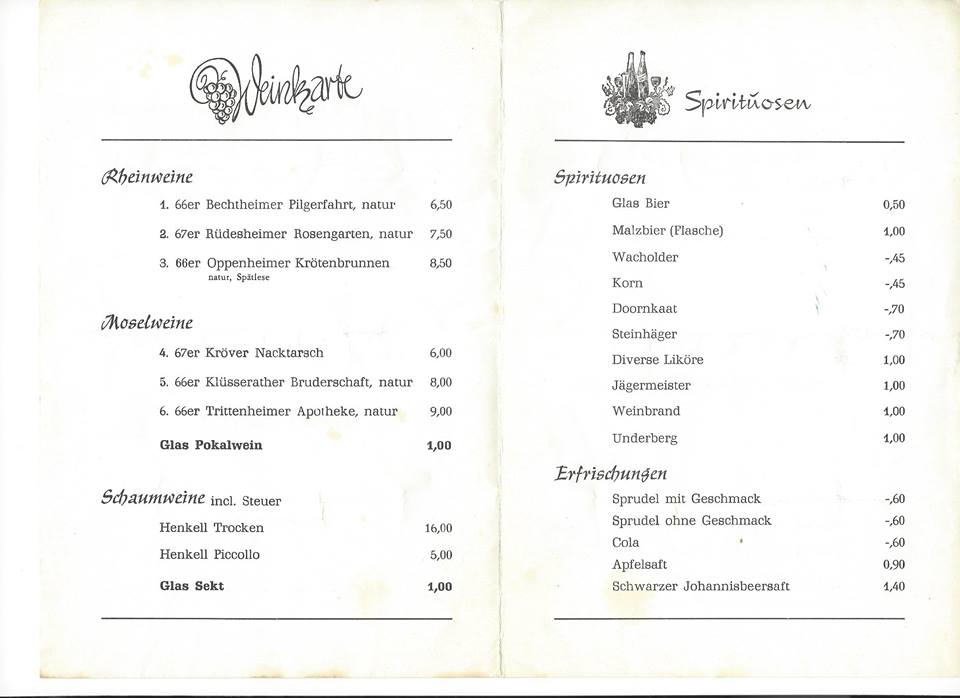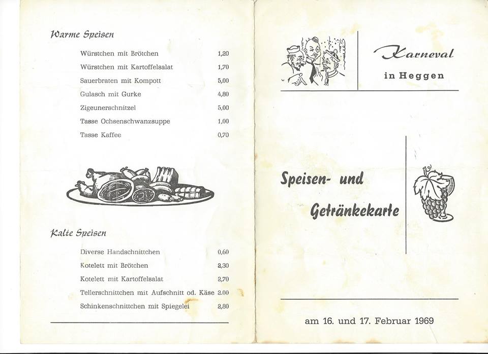 Das Foto zeigt die Speise- und Getränkekarte Karneval 1969. Man beachte vor allem den Bierpreis von 0,50 DM! ![]()